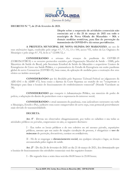 A Prefeitura de Nova Olinda do Maranhão no uso das atribuições legais emitiu nesta quinta-feira(25) um decreto municipal que decreta o uso de máscaras, distanciamento social,horários reduzidos no comércio de Nova Olinda do Maranhão.